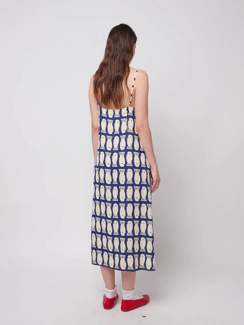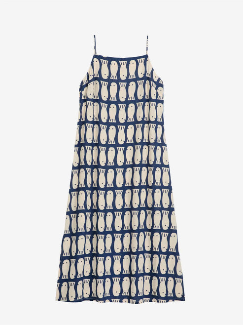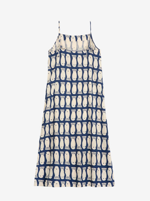 This navy blue dress combines simplicity and fluidity with its slightly loose fit and adjustable shoulder straps. Made from 20% linen and 80% viscose, its lightweight, non-stretchy fabric and midi length create an effortlessly refined silhouette. Produced in Spain, with sustainability in mind.
