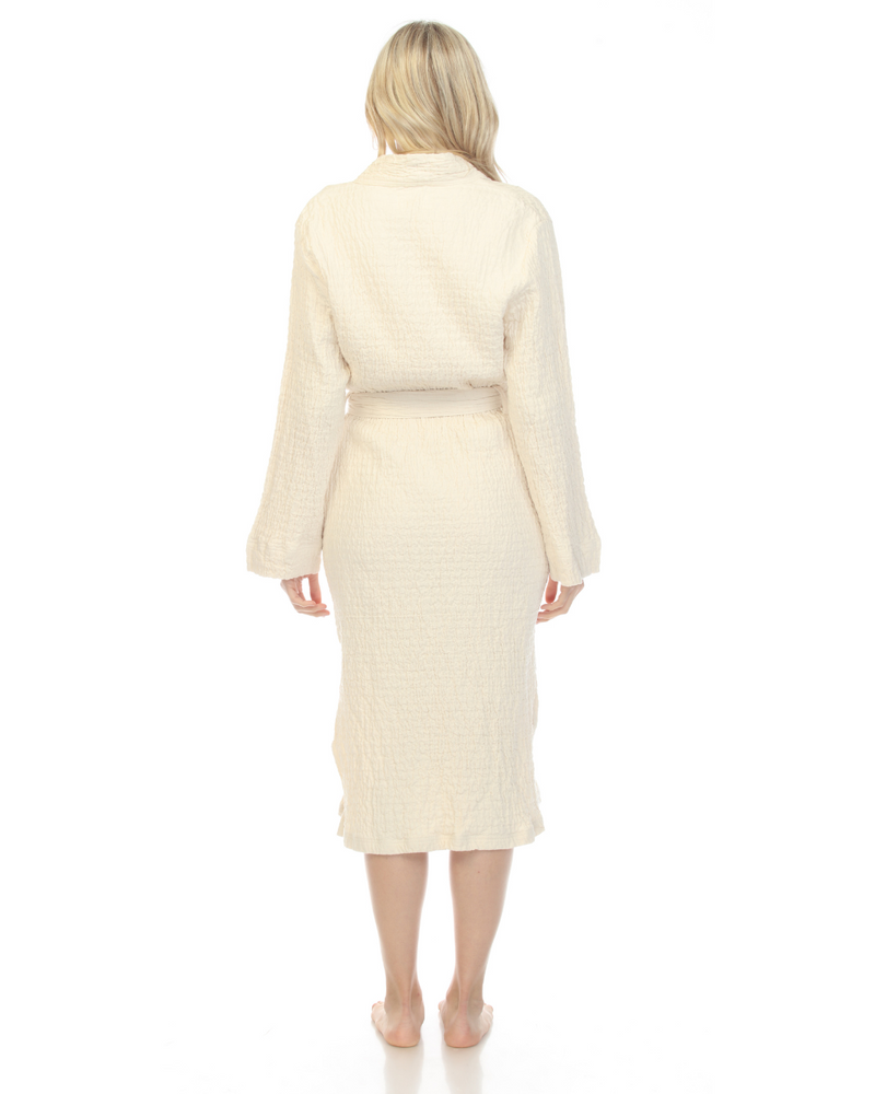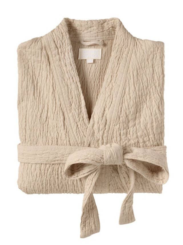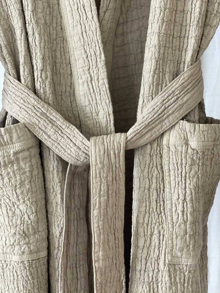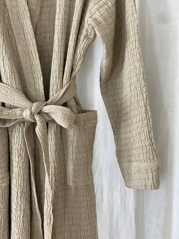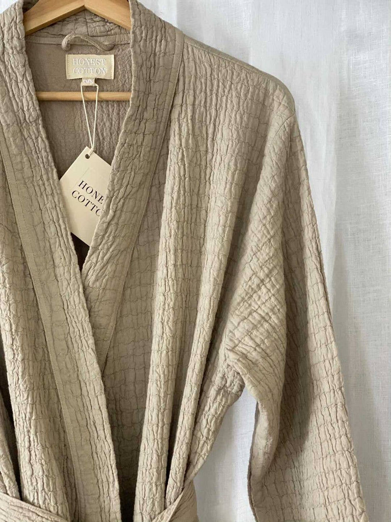 Honest Cotton's fall cotton robe will become a daily addition to your wardrobe. Available in their popular crinkle cotton, this robe offers full coverage and is unisex. This crinkle cotton is thick and luxurious. Prepare to fall in love. One size - unisex Finished with french seams