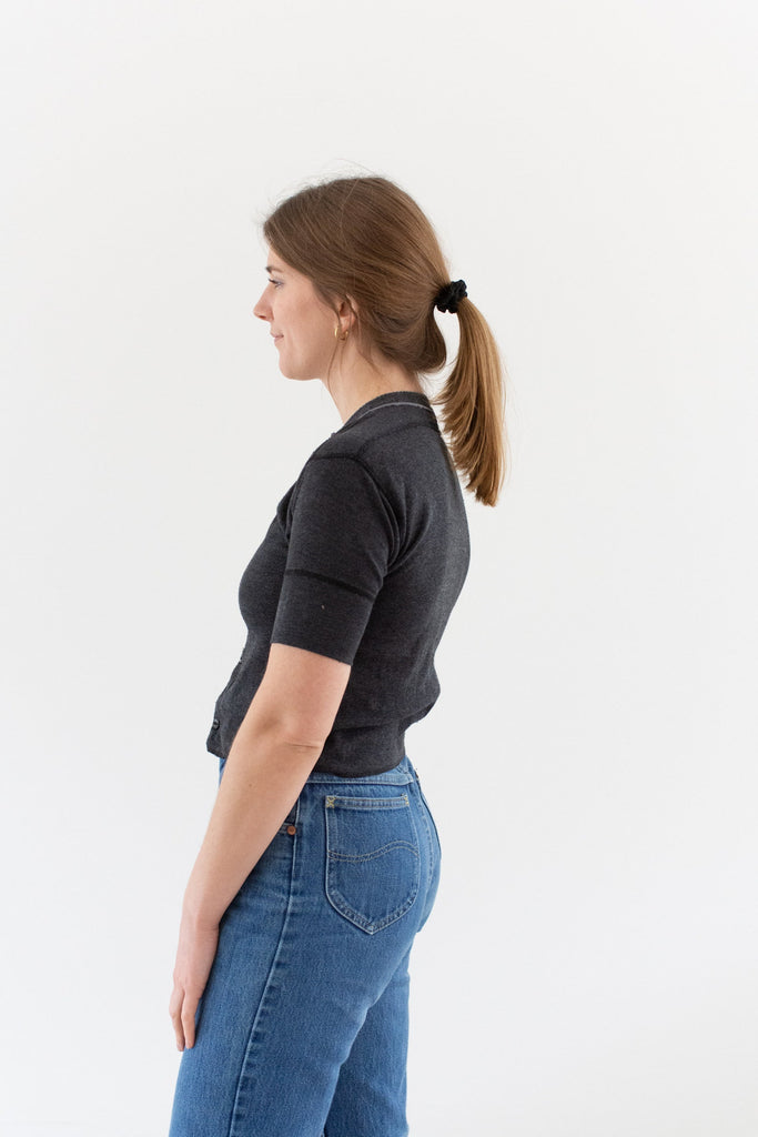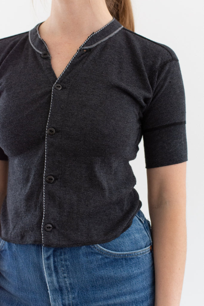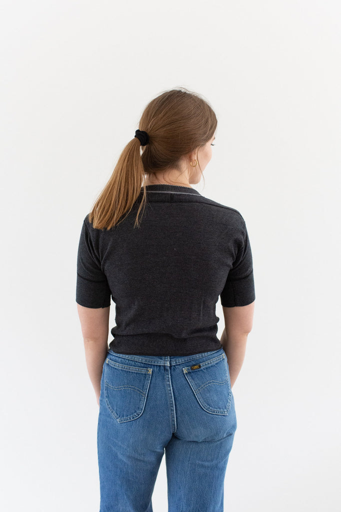Vintage soft black rib knit short sleeve henley with cat eye buttons and picot edging. Beautiful statement piece. Originally used a military onesie now hemmed to shirt length with serge hem.