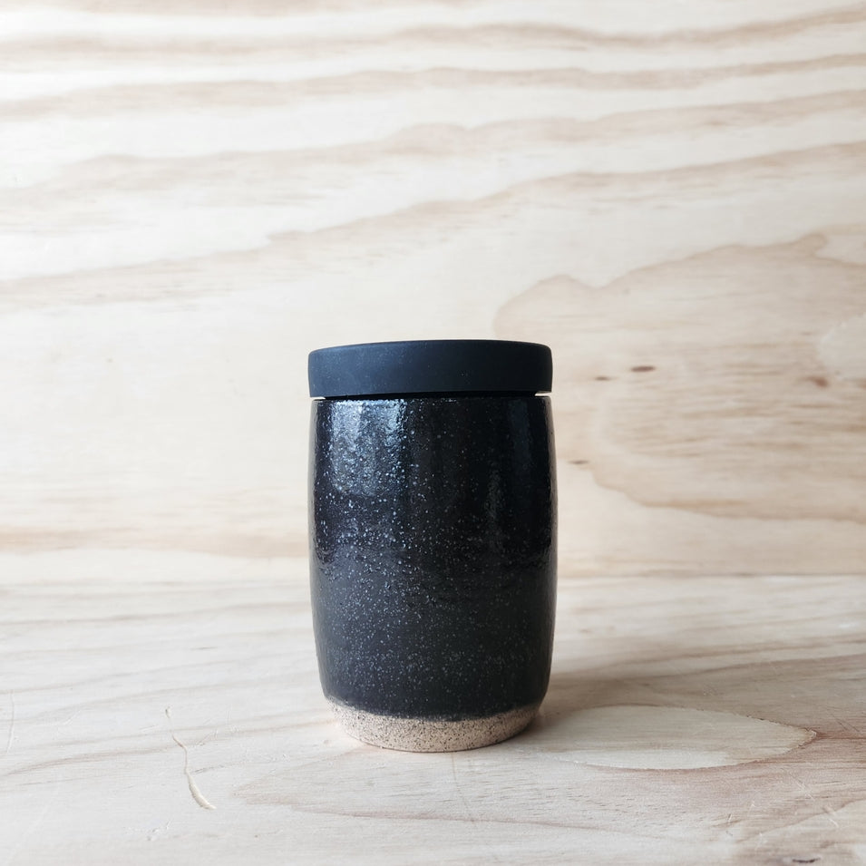 Stoneware, wheel-thrown travel cup (12 oz) with single color glaze. Includes silicone lid.
