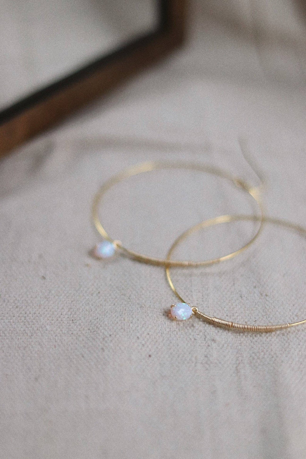 Oval opal charm. Oval opalite stones on 2 inch hand wrapped hoop, lightweight, gold plated hoop with gold filled earwireor silver.