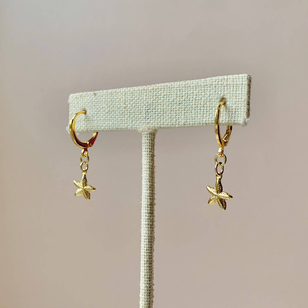 BEACHY-CHIC STARFISH DANGLES -Popular huggie hoop style. -Easy-close clasp is secure on the ear. SAFE FOR SENSITIVE SKIN -Free of nickel, lead, & metals that irritate the skin. -Will not turn skin green. ANTI-TARNISH GOLD LAYERED -Our gold layers are wonderfully thick. -Durable for long-term wear. SIZE -Huggie hoop: .5” -Total length of earring: ~1.2"
