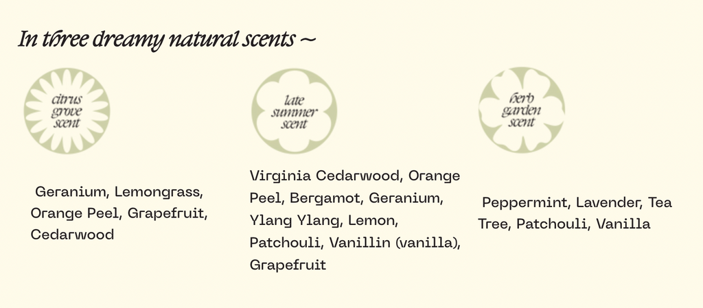 Late Summer: Virginia Cedarwood, Orange Peel, Bergamot, Geranium, Ylang Ylang, Lemon, Patchouli, Vanillin (vanilla), Grapefruit
