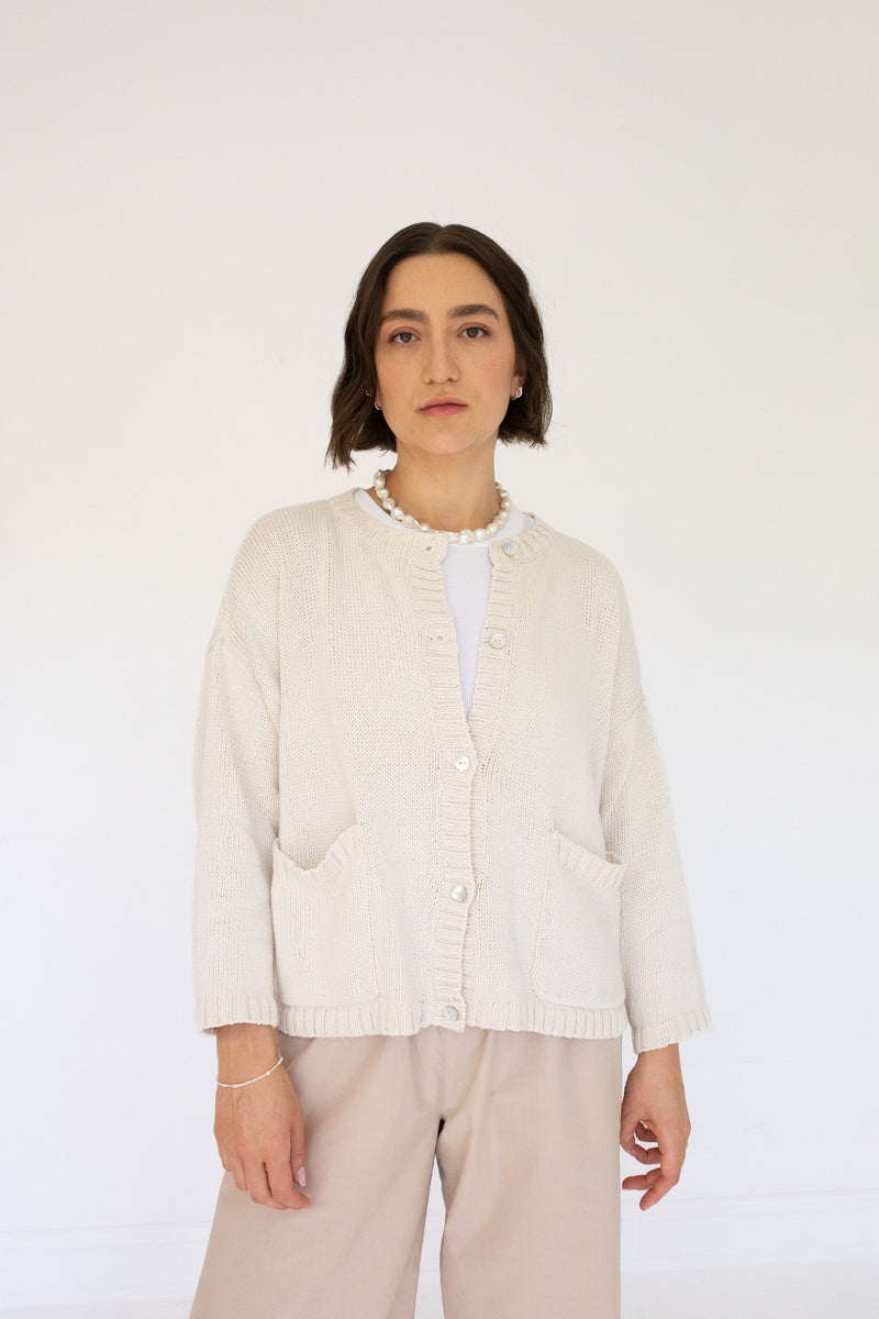 Stay cozy and stylish with our Honest Cotton - Louisa Cardigan. Made with 100% cotton, it features delicate shell buttons, big front pockets, and a versatile design that looks great with any outfit. Perfect for layering over a tank, jeans, or a dress, the charming details make it a fashion must-have. Go ahead, have fun with your look!