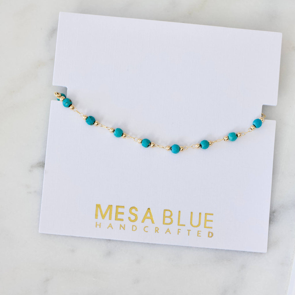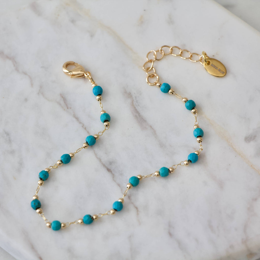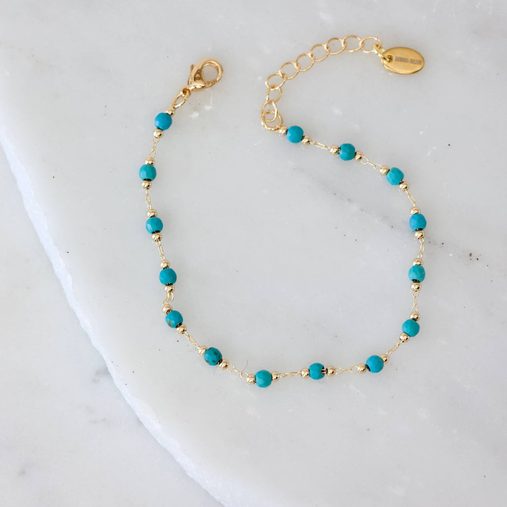 Details: • MATERIAL: Round, faceted, turquoise beads, 18K gold plated over brass • CLASP: Lobster clasp • SIZE: Gold plated over brass 6.5" + 1.5" extender