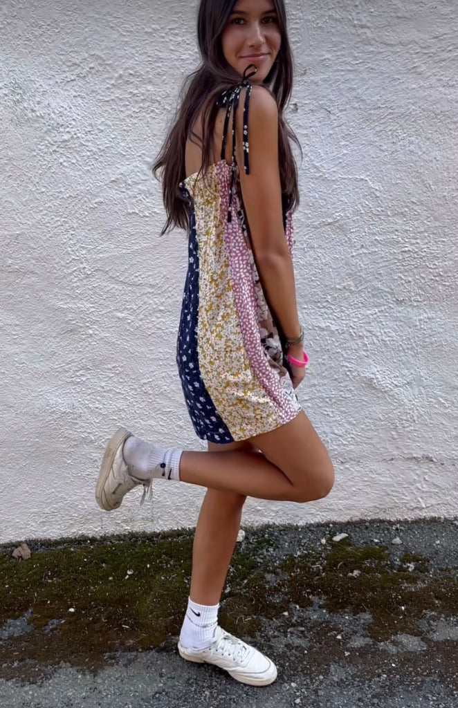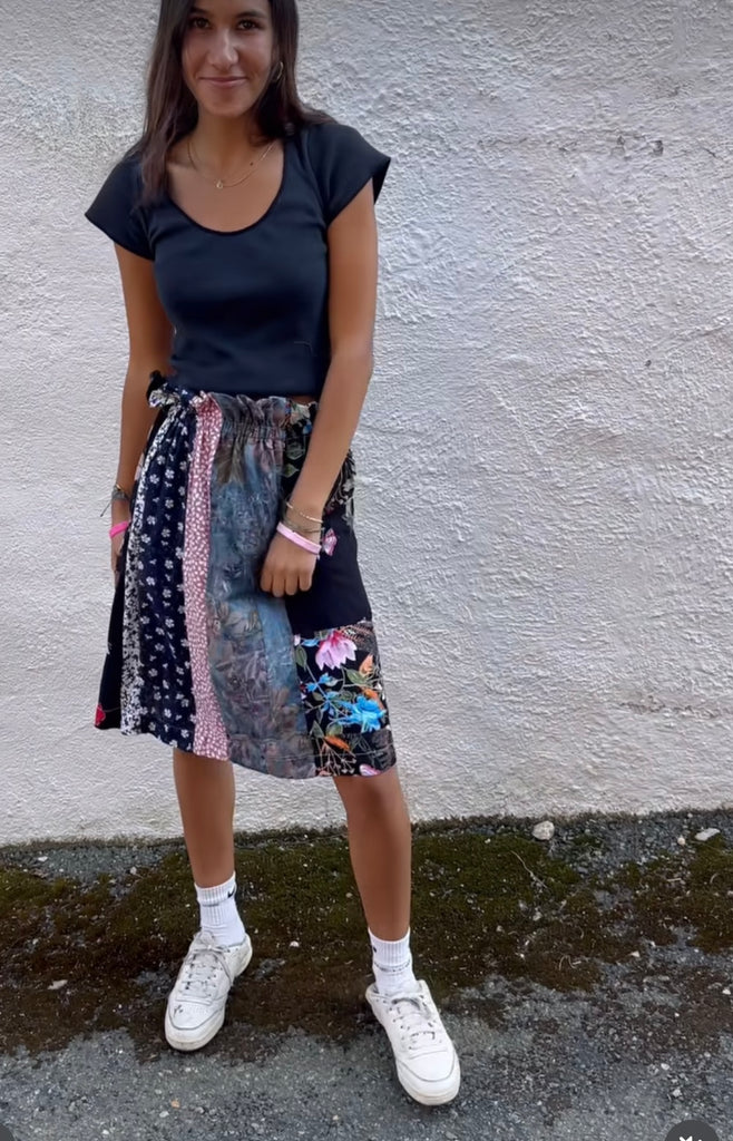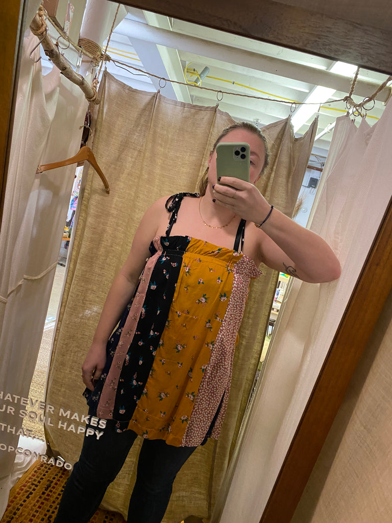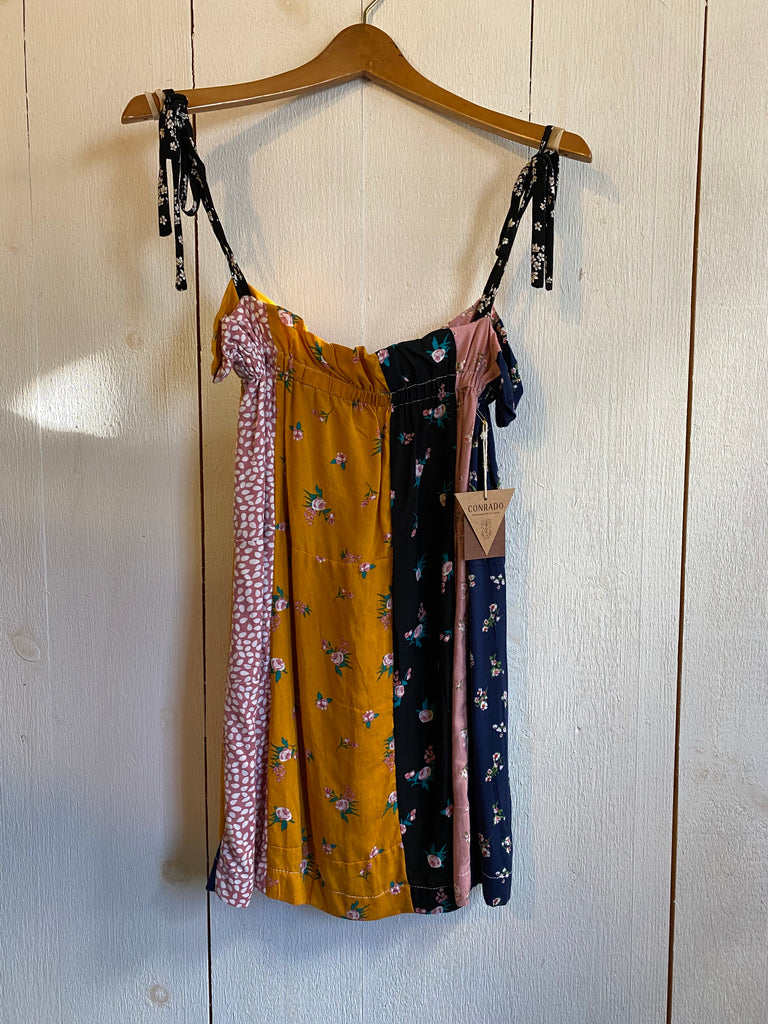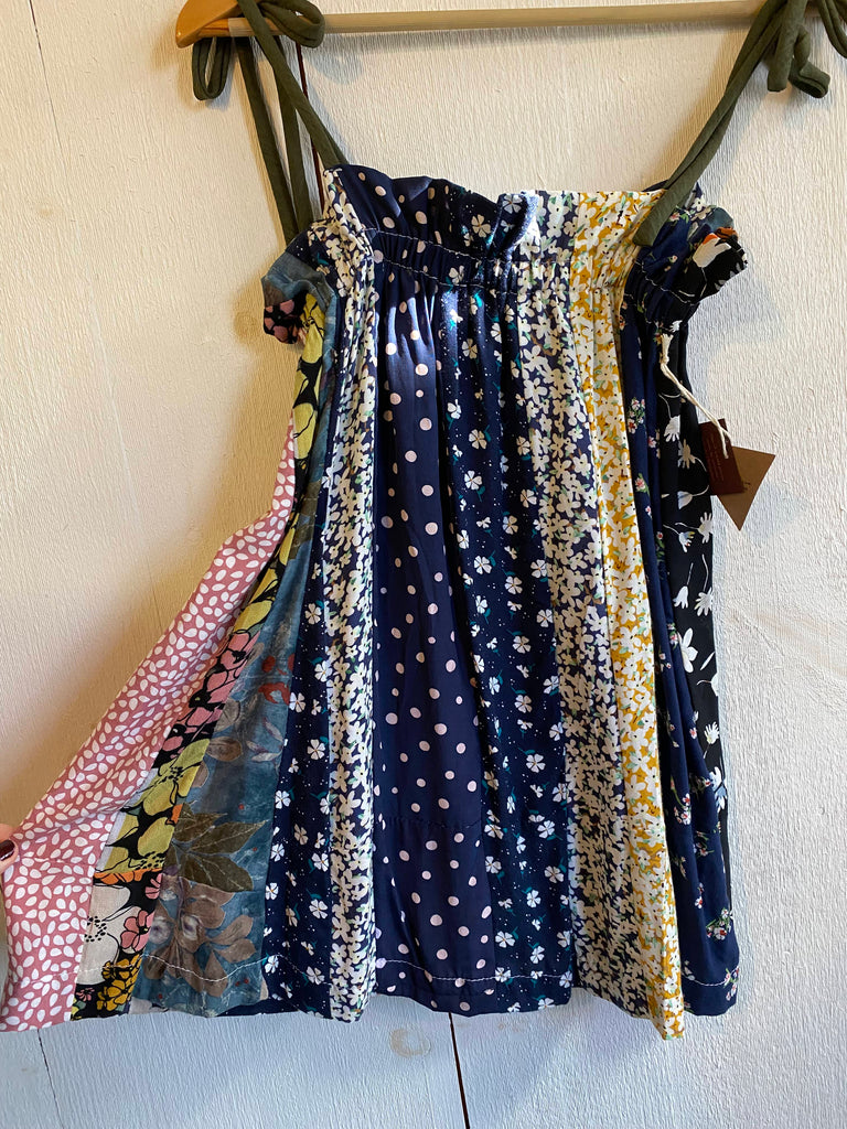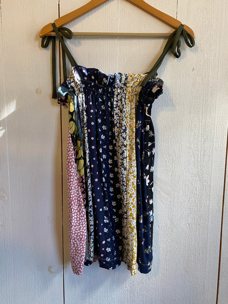 A fun patchwork mini dress/ tunic made with our fabric scraps so it's zero waste!