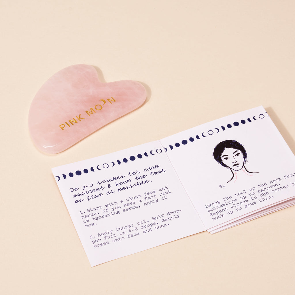 • This mini kit includes a heart-shaped rose quartz gua sha tool, an easy-to-follow gua sha instruction card, and a pink velvet pouch to protect and store your tool
