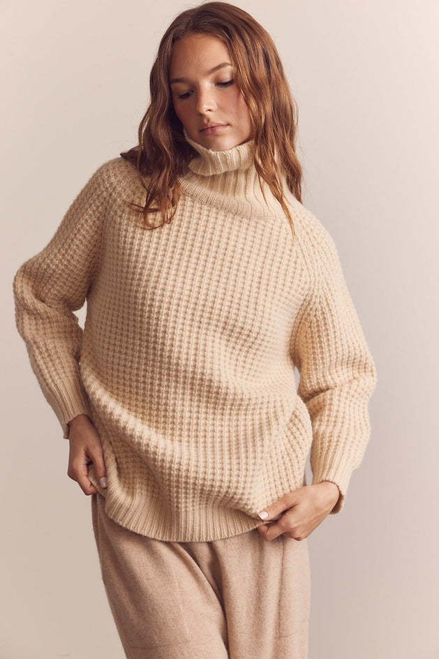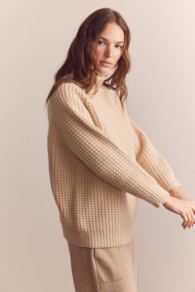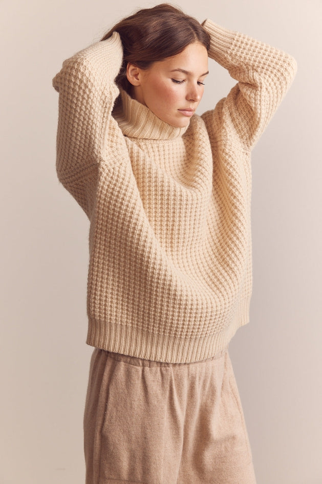 Introducing the quirky and playful Amente's Wool Turtleneck Waffle Sweater - a must-have for your winter wardrobe. Made from premium fine wool, this sweater boasts a cozy waffle-knit texture that provides both warmth and breathability. The classic turtleneck adds a layer of protection against the chill, while the relaxed fit ensures all-day comfort. Whether worn on its own or layered under a coat, this versatile sweater brings a touch of timeless elegance to any outfit. Perfect for both casual and fancy occasions, it's an essential staple for easy winter dressing.