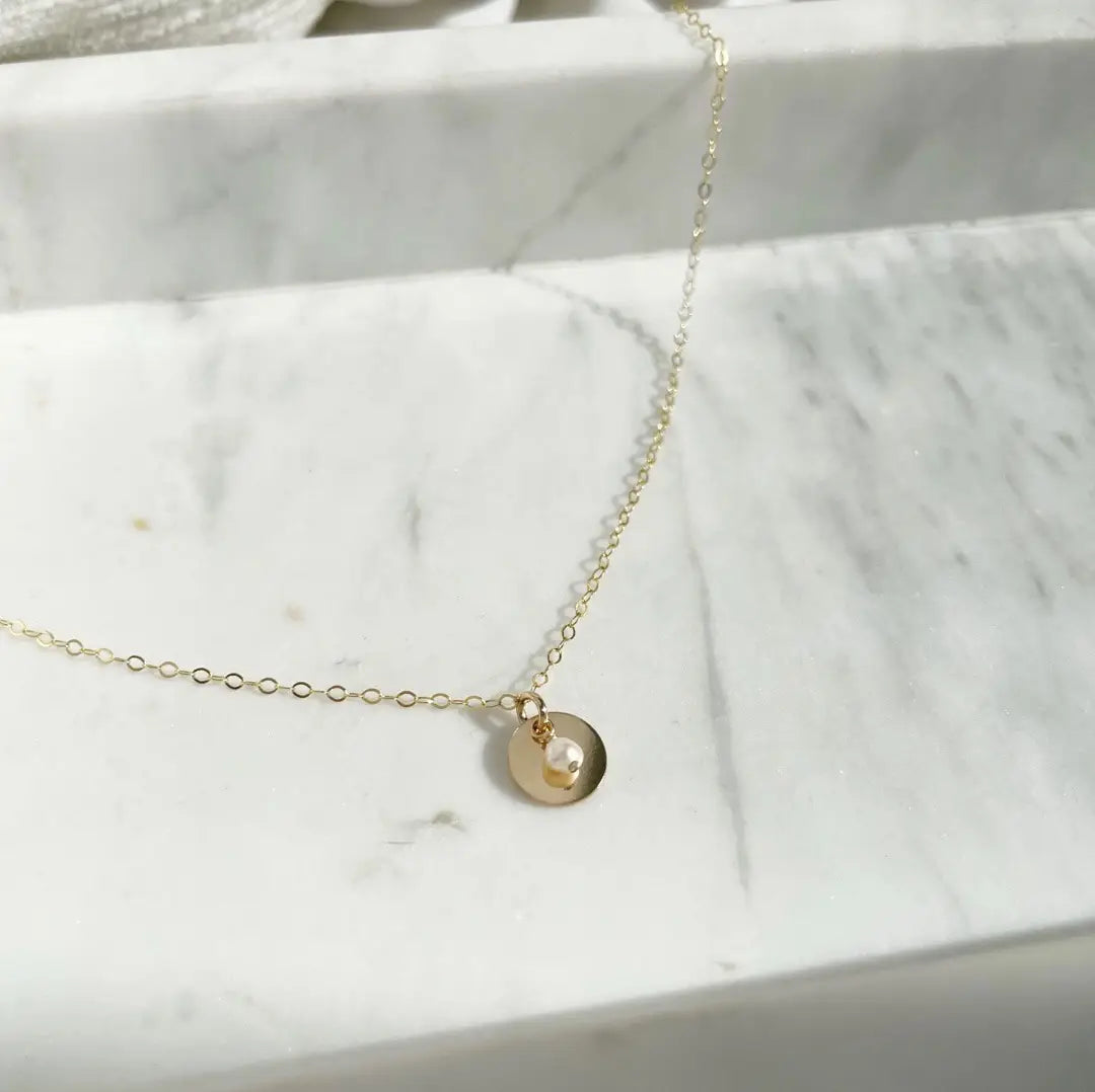 This necklace is a favorite for everyday wear and makes the perfect gift. A delicate brushed disk and tiny gemstone hang from a beautiful chain.