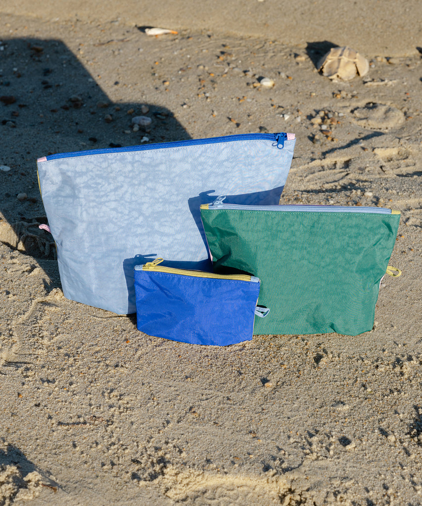 Baggu's Go Pouch Set makes it easy to keep your bag neatly packed and organized. Whatever you're toting—coins, cords, or an extra pair of shoes—this set of three all purpose pouches keeps it together. They expand to hold your essentials and lay flat when not in use.