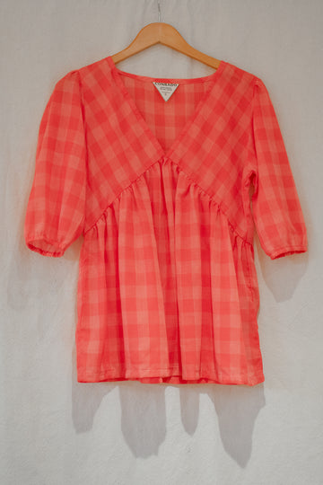 A v-neck take on a puff-sleeved boho top. Empire cut and has wide 3/4 length sleeves with an elastic at the cuff for the billowy puff sleeve look.