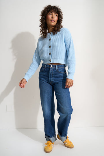 This lovely Callahan cardigan is available in a delicate baby blue, striking a perfect balance between refined elegance and whimsical playfulness. With its button-up closure and slightly cropped design, it's a versatile choice for layering and effortlessly transitions between seasons. Rock it on a casual outing or a snug evening in for a unique touch to your ensemble. Pair it with a basic tee or high-waisted denim for a comfortably charming outfit.