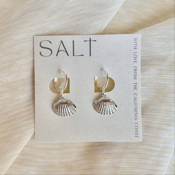 BEACHY-CHIC SHELL DANGLE EARRINGS Scalloped seashell earrings for the coastal soul. Popular huggie hoop style. Easy-close clasp is secure on the ear.