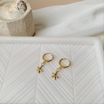 BEACHY-CHIC STARFISH DANGLES -Popular huggie hoop style. -Easy-close clasp is secure on the ear. SAFE FOR SENSITIVE SKIN -Free of nickel, lead, & metals that irritate the skin. -Will not turn skin green. ANTI-TARNISH GOLD LAYERED -Our gold layers are wonderfully thick. -Durable for long-term wear. SIZE -Huggie hoop: .5” -Total length of earring: ~1.2"