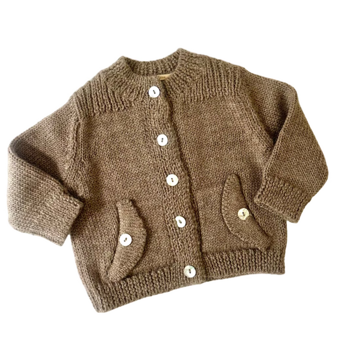 A new addition to our coveted baby alpaca styles, this delicious cardigan is crafted in the softest baby alpaca yarn.  The natural property of baby alpaca fiber is hypoallergenic, breathable, and self temperature regulating.  Adorned with natural shell buttons at the center front and pocket closures, the ultra plush, and lofty hand is most desirable in the cooler months.  Intentional rib change at the shoulder provide a modern detail.