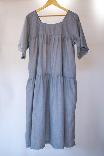 Ula Blue Grey Striped Midi Tiered Boho Dress
